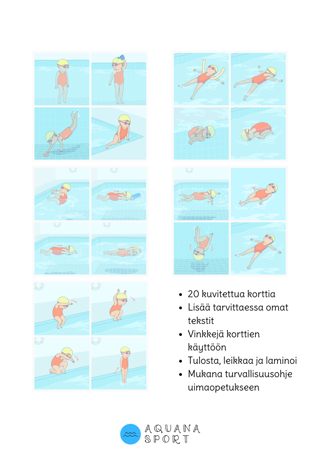 Siksi suunnittelin uimaopetuksen kuvakortit, jotka tuovat opetukseen selkeyttä, iloa ja monipuolisuutta. Kortit havainnollistavat liikkeitä lapselle helposti ymmärrettävällä tavalla ja auttavat ohjaajaa luomaan sujuvia ja innostavia tunteja.